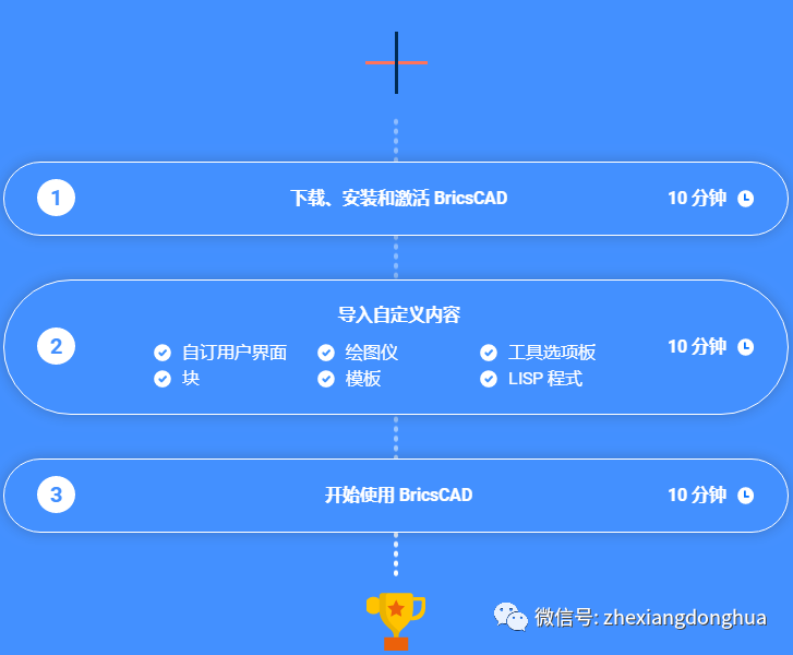 从 AutoCAD 切换到 BricsCAD 很容易。在几分钟内导入您当前的自定义。您可以在一小时内熟习BricsCAD,并且在一天内便能精通。