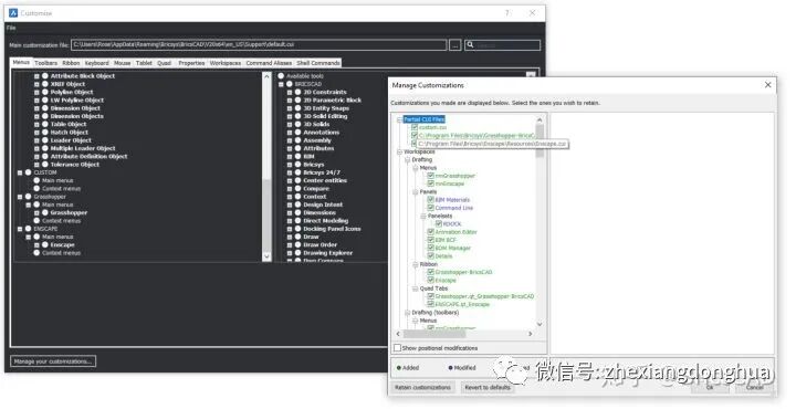 使用自定义(CUI)命令定制用户界面元素,如ribbon和工具栏,这一点跟AutoCAD也类似。像AutoCAD一样,如果您之前使用过自定义功能,您可以加载现有的自定义参数。而且,在BricsCAD中,您甚至可以单独管理自定义参数,轻松识别添加、修改或删除的内容,并选择保留或恢复到默认值。