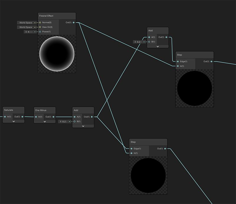 顶部部分呈现了白色轮廓,可以从特定角度观察到,它只出现在已经受光的区域。所以该部分与表示卡通效果的Smoothstep相乘,所以它不会在黑暗区域呈现。Step函数偏移了0.2,这意味着该效果只会出现在靠近形状边缘的位置,使二个效果可以共存和重叠。