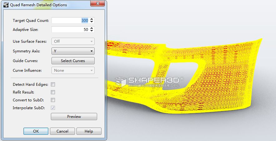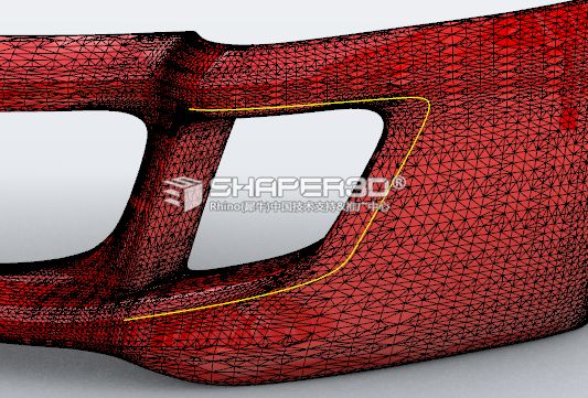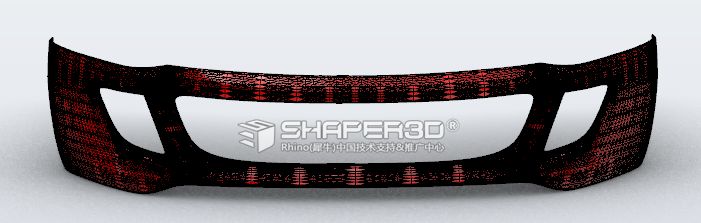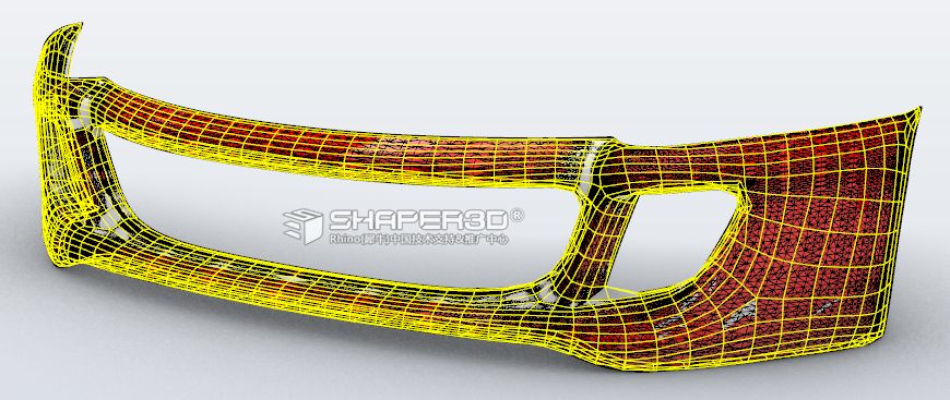 这个汽车前保险杠模型由三角网格构成,要直接修改造型及转换成NURBS曲面那是非常困难的,现在我们借助 QuadRemesh 指令,对其进行“优化”成四边网格的结构,以便我们进行后续编辑。