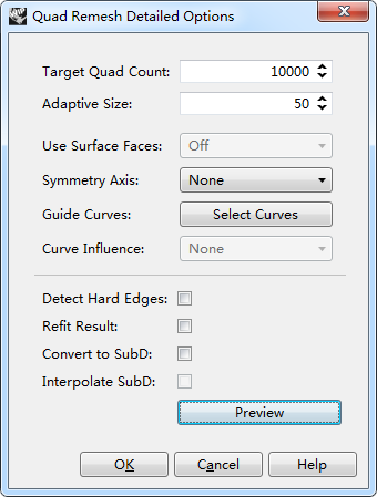 运行QuadRemesh 指令,选取模型后会弹出以下这个选项面板:
