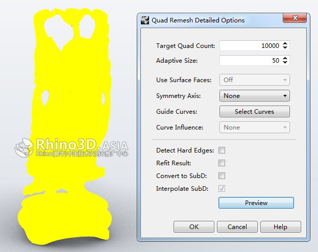 对结构如此复杂的模型进行重算网格,对目标面数不能太少,因为低面数会失去细节或结构,因此Target Quad Count 设定一万面数,Adaptive Size 保持默认值50,点击 Preview 按键,预览生成的结果:
