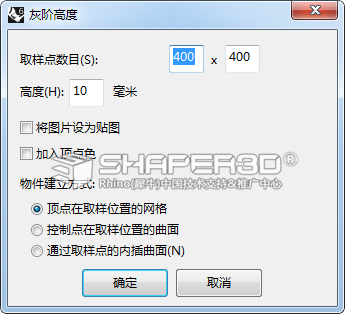 运行 Rhino 中的 Heightfield 指令,选取这张灰度图片,拖动鼠标在工作视窗中确定好大小,取样点400X400,生成网格。